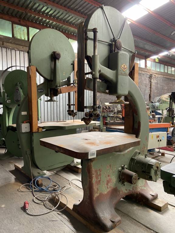 Litinová pásová pila Primultini se 100cm setrvačníkem s naklápěcí lavicí, maximální užitečný průchod prken 90 cm. výkon motoru 10 hp. Použitý.