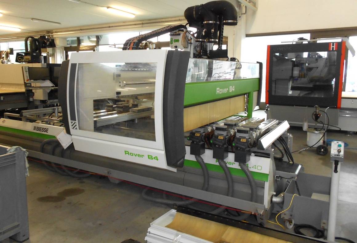 Centro de mecanizado BIESSE ROVER B4.40, con certificación CE, año 2006, dimensiones 3060 x 1250 mm, 6 mesas ATS con elevador de paneles, electromandril de 4 ejes, cambiador de herramientas de 12 posiciones, unidad de taladrado con cuchilla en el eje X.